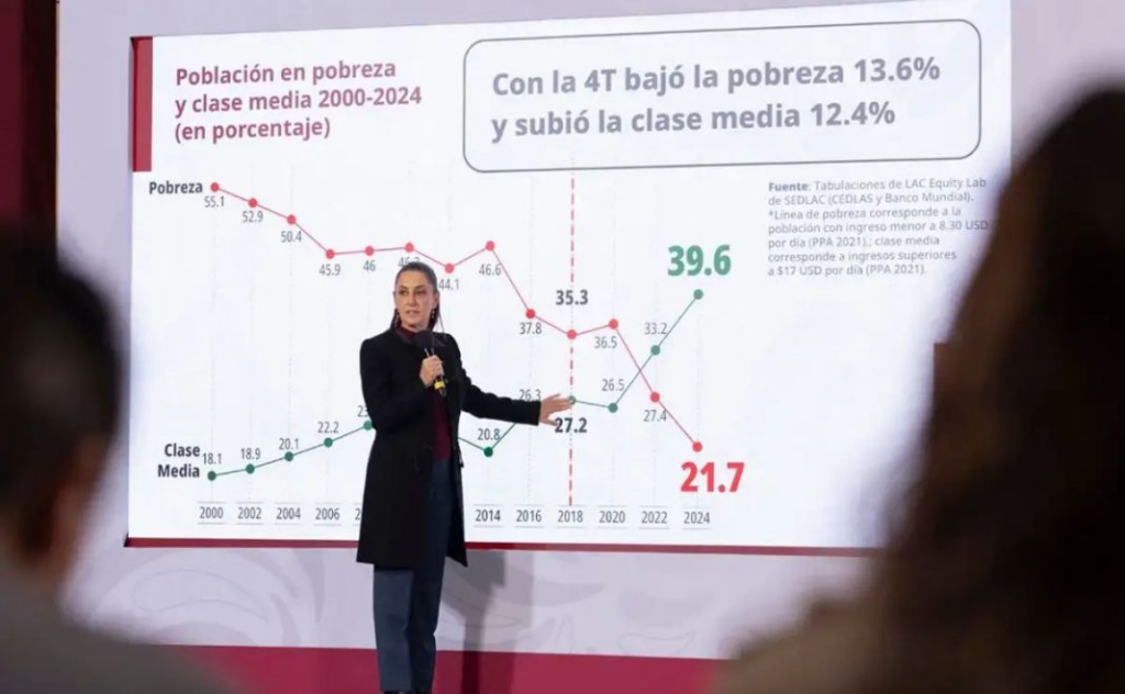 De acuerdo con cifras del Banco Mundial presentadas por Jesús Ramírez, coordinador de asesores de la Presidencia, la proporción de personas en pobreza se redujo drásticamente del 35.5% al 21.7% entre 2018 y 2024. De forma paralela, la clase media creció del 27.2% al 39.6%.